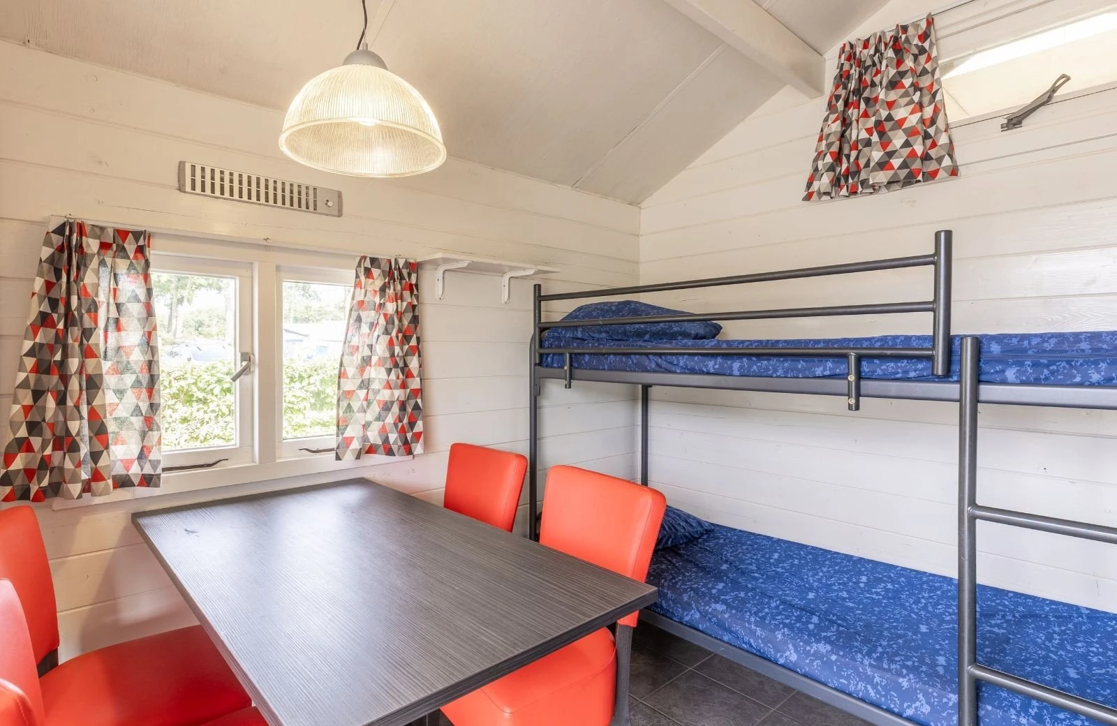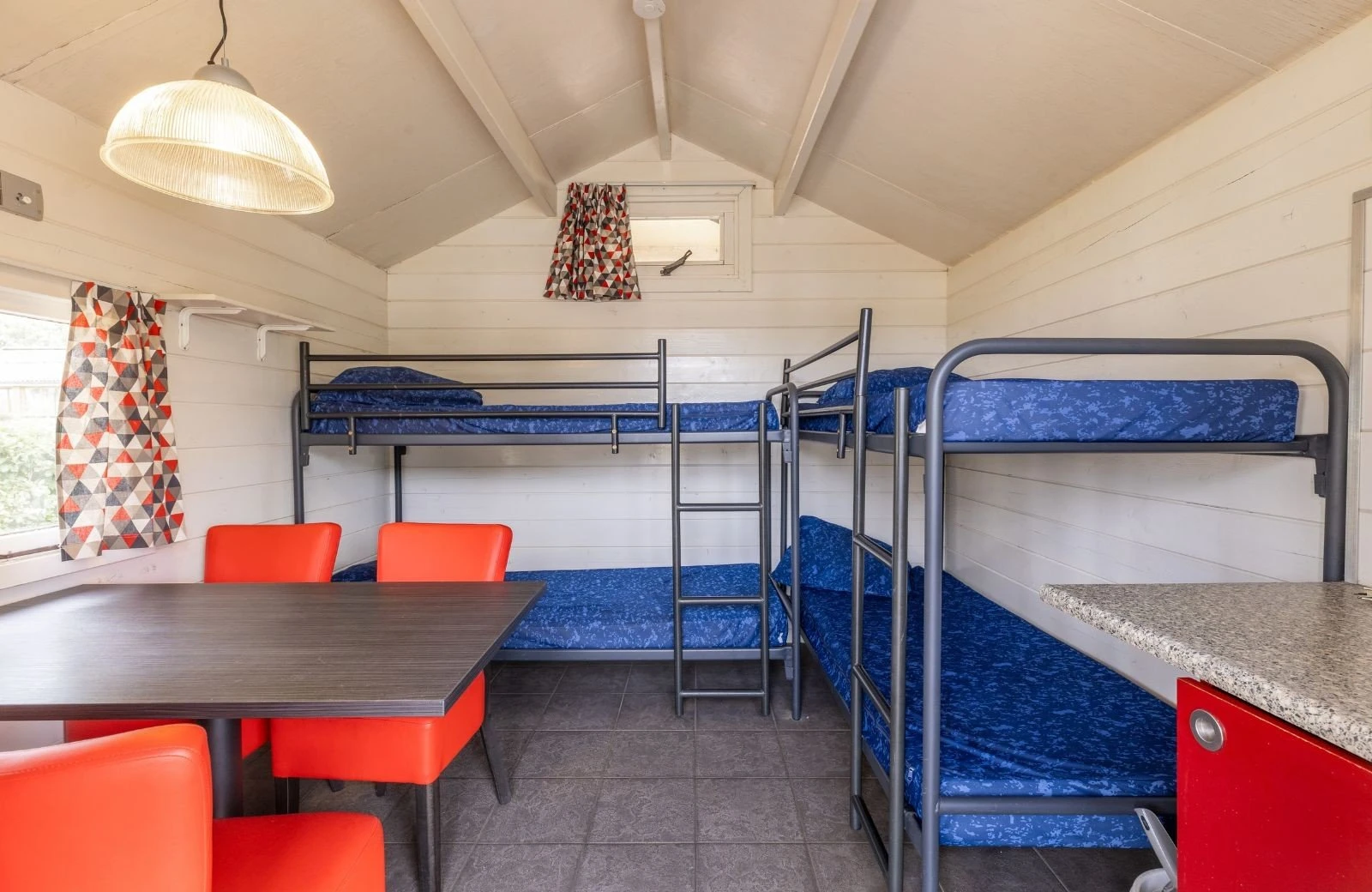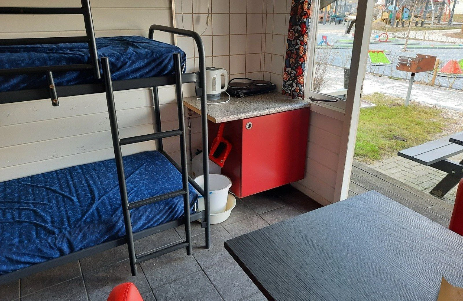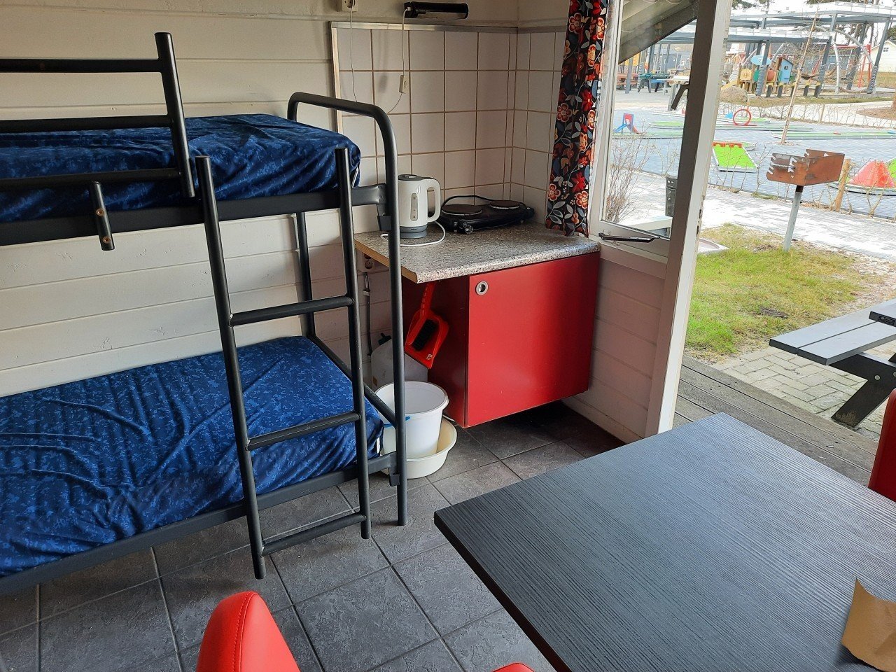Die Campinghütte ist einfach eingerichtet mit zwei Etagenbetten, einer Essecke mit 4 Stühlen und Basisausstattung wie einem kleinen Kühlschrank, zwei elektrischen Kochplatten, einem Ofen und einem Wasserkocher. Draußen steht eine Picknickbank, damit Sie schön im Freien essen können. Das Sanitärgebäude liegt in der Nähe, da die Hütte kein eigenes WC oder Dusche hat.